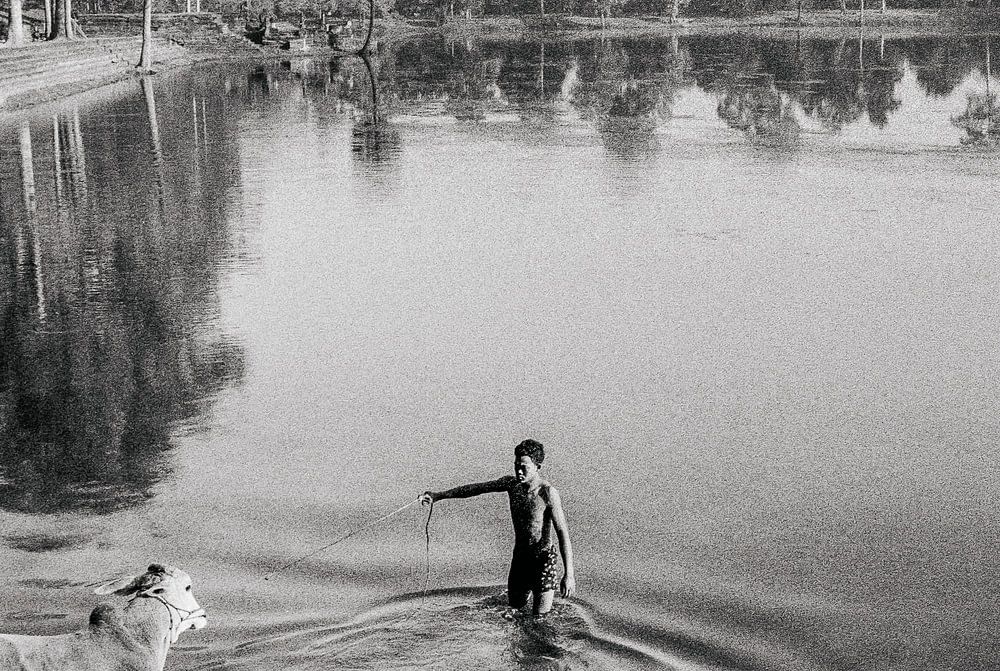 Wie ein Orchester wird ein Büffel von dem jungen kambodschanischen Hirten geschickt durch das Wasser geführt. Um sich mit frischem Wasser zu erfrischen.