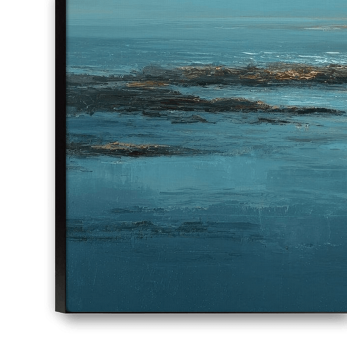 Ein Ölbild zeigt einen ruhigen Ozean, in dem sich das Licht der Sonne sanft auf der Wasseroberfläche spiegelt. Aus niedriger Perspektive gemalt, vermittelt das Werk Tiefe durch atmosphärische Perspektive. Der Himmel strahlt in Blau, während die goldene Stunde die Szene in warme, gedämpfte Farbtöne taucht. Weiche Pinselstriche verstärken die ruhige, friedliche Stimmung und schaffen eine realistische Darstellung von Licht, Wasser und Weite. Dieses Gemälde fängt die stille Schönheit des Meeres ein und eignet sich ideal für Liebhaber realistischer Landschaftsmalerei, maritimer Szenen und dekorativer Wandkunst.
