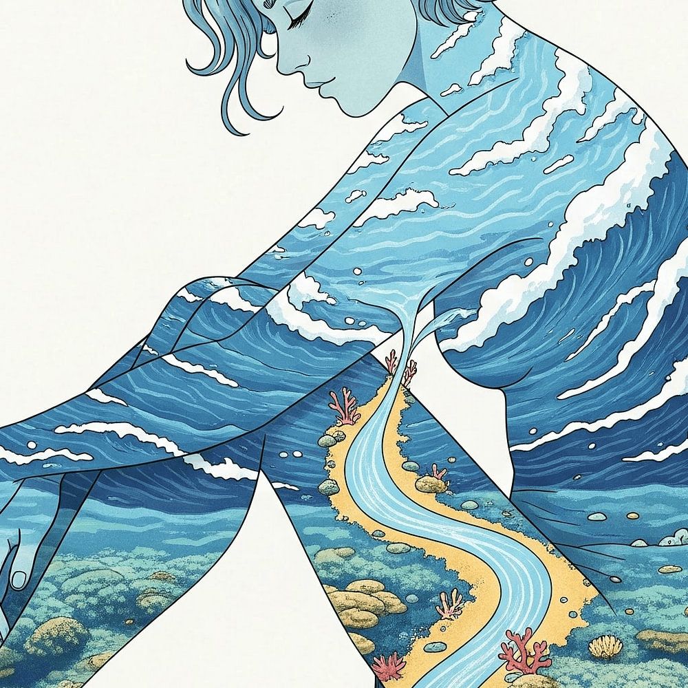 In ozeanischer Gelassenheit versunken, verkörpert die Frau die Kunst der Natur'. Eine ruhige Szene, die die Schönheit von Wasser, Korallen und friedlichen Wellen zeigt. Ideal für Themen des Umweltbewusstseins und der introspektiven Kunst.