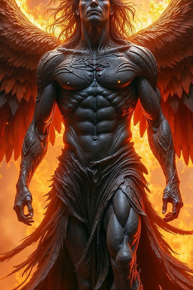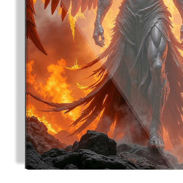 Aus einem Meer aus Feuer tritt Luzifer hervor, der brennende Erzengel aus der Hölle, mit ausgebreiteten Schwingen, die selbst zu Flammen geworden sind. Glühende Federn zeichnen sich gegen den rauchverhangenen Himmel ab, während der Boden unter seinen Schritten aufbricht. Sein Blick ist ruhig, unbeugsam, getragen von uralter…