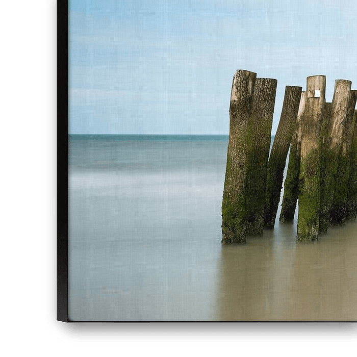 Paaltjes in zee met een blauwe lucht met wolken en stilstaand water