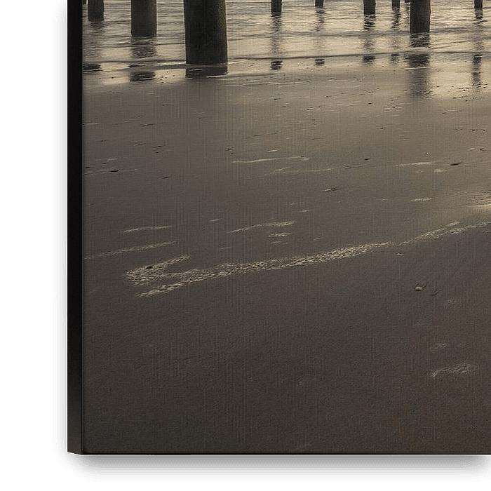Am Strand und im Meer, in der Nähe des Dorfes Petten, gibt es ein Dorf mit Pfählen. Es ist ein schöner Anblick mit einer schönen untergehenden Sonne! Schauen Sie sich das Bild gut an... Sie werden so angezogen sein...