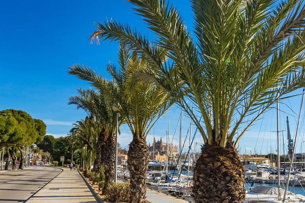 Palma de Mallorca Stadtzentrum Straße und Bürgersteig an der Küste des Yachthafens, Spanien Balearische Inseln