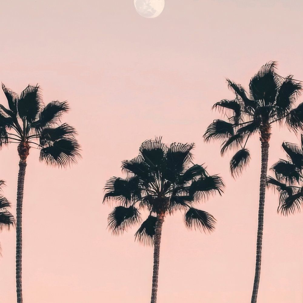 In sanften Pastelltönen schwebt der Mond über einer Reihe stolzer Palmen, die sich elegant gegen den Himmel abheben. Die ruhige Szenerie strahlt eine entspannte, sommerliche Atmosphäre aus, während das Licht der Dämmerung eine magische Stimmung erzeugt. Ein Wechselspiel von Schatten und Licht verleiht diesem Moment eine besondere Tiefenwirkung.