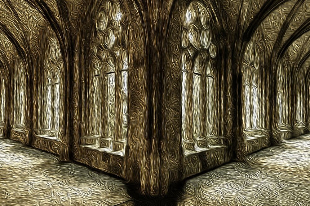 Der Pandhof neben der Domkirche in der Stadt Utrecht, aufgenommen mit einem Ultraweitwinkel von André Blom Photography aus Utrecht. Wenn man zwei verschiedene Gänge hinunterschaut, kann man die Gewölbe und die gotischen Bögen sehen.