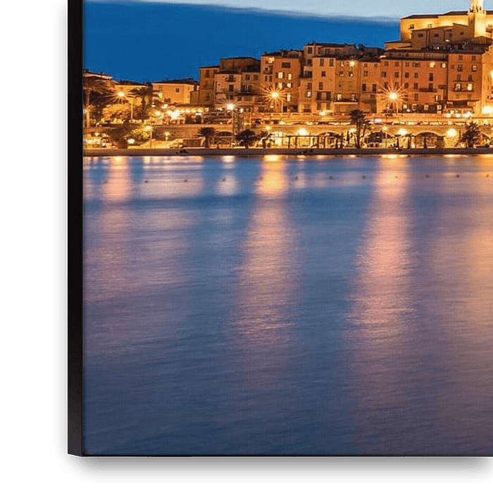 FOTOGRAFIE Panoramaaufnahme Altstadt von Menton mit der Basilika St-Michel-Archange bei Nacht, Côte d'Azur, Frankreich