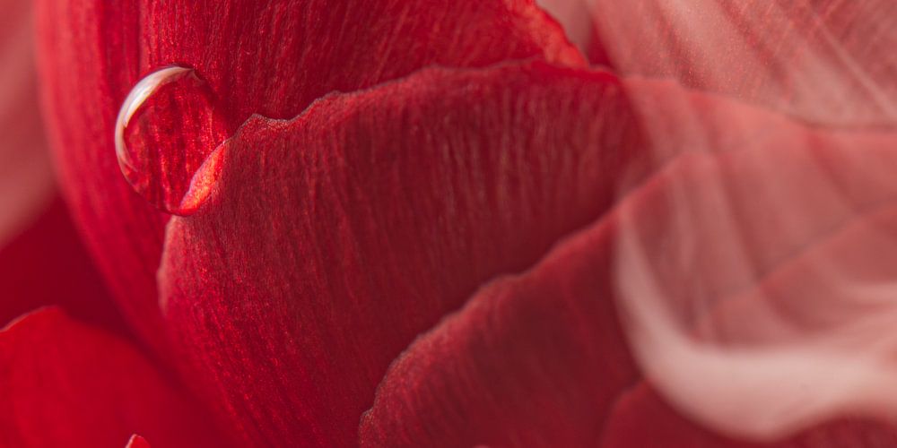 Bestelle dieses Blumen-Wandbild Panorama eines weißen Rauchschleiers über einer roten Ranunkel von Marjolijn van den Berg als Reproduktion auf Leinwand, Alu-Dibond, als Poster, Fototapete oder Acrylglasbild.