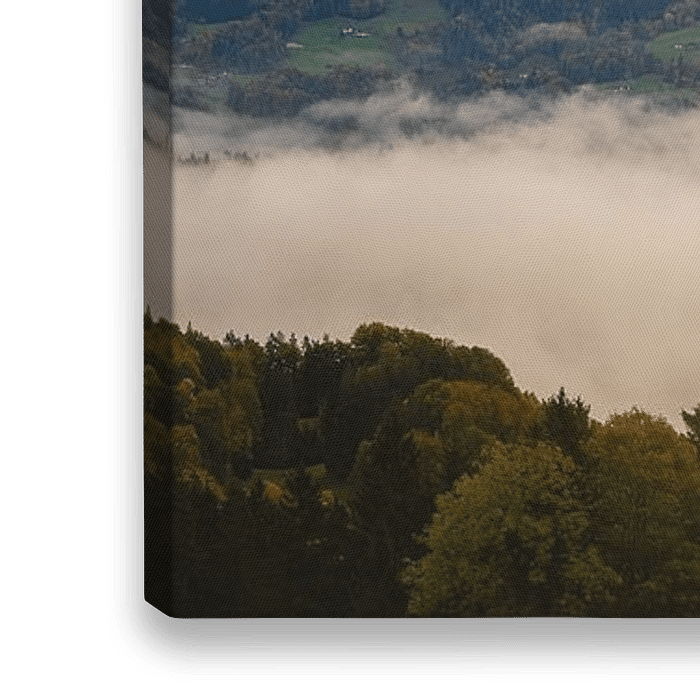 Blick über ein Tal im Nebel zu den Bergen Kehlstein, Hoher Göll und Hohes Brett in den Berchtesgadener Alpen an einem Morgen im Herbst