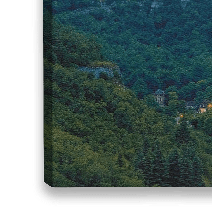 Ein 2:1-Panoramabild eines Abends bei Sonnenuntergang in Rocamadour, einer Stadt und Pilgerstätte in Frankreich.