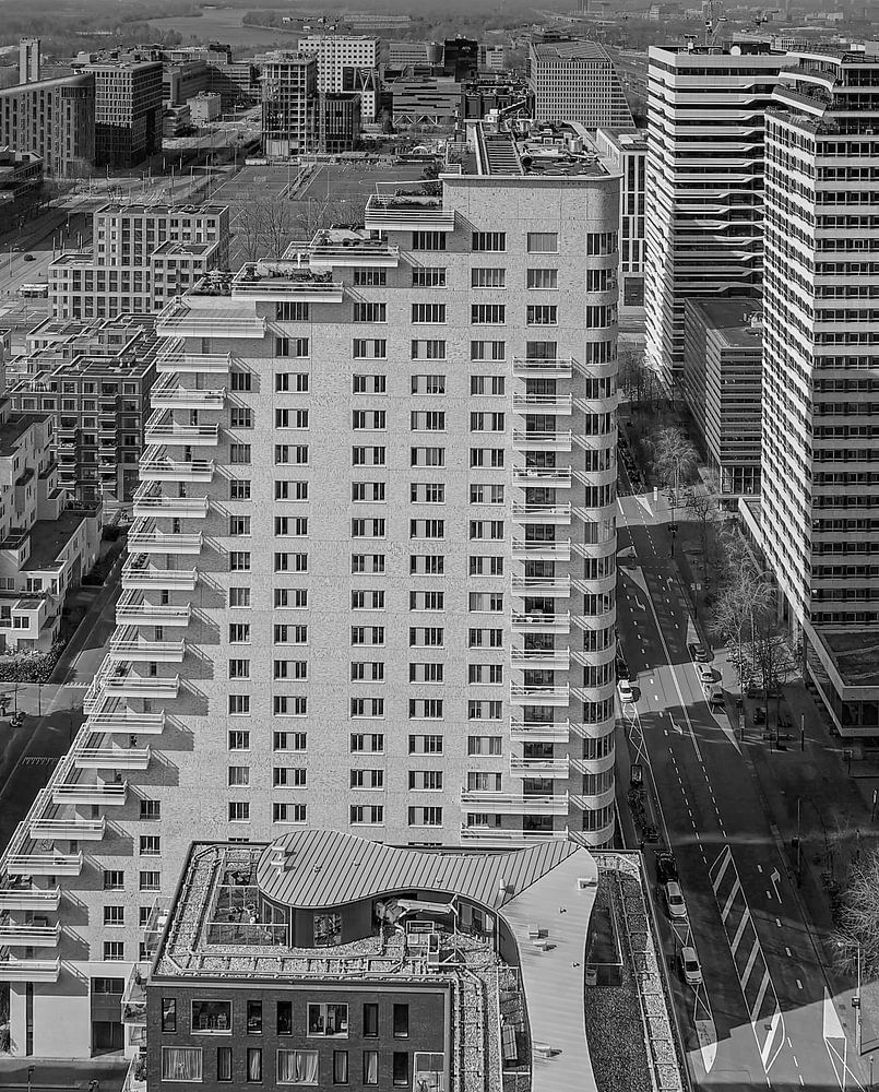 Das Foto wurde im Hochformat aufgenommen, um die Höhe der Gebäude zu betonen. Die Gustav Mahlerlaan wird gezeigt, wo es relativ ruhig ist, da es ein Samstag ist. Im Hintergrund ist das Nieuwe Meer zu sehen. Das Foto wurde während des Tags des offenen Turms 2022 aufgenommen. Der Open Tower Day Amsterdam ist eine jährliche Veranstaltung in Amsterdam. Ziel ist es, alte und moderne Türme zu erschließen, die normalerweise der Öffentlichkeit nicht zugänglich sind.