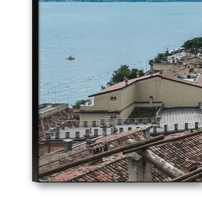 Blick auf die schöne Limone am Gardasee. Die Berge des Monte Baldo im Hintergrund und der Gardasee im Vordergrund. Wunderschöne mittelalterliche Stadt.