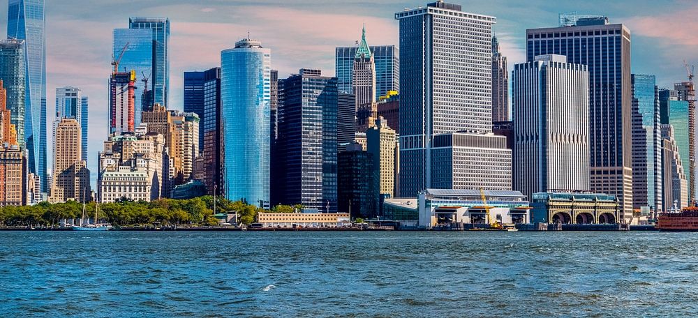 New York, Manhattan, von Staten Island aus gesehen, Sonnenaufgang im Sommer. Manhattan, Jersey Shore und Brooklyn Bridge sind zu sehen.