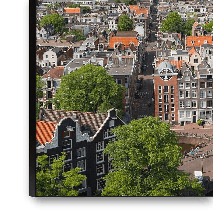 Panoramablick über den Frühling Amsterdam mit den berühmten Kanälen. Blick vom Westerkerk-Turm (Westkirchenturm) über die Dächer der Kanalhäuser an der Prinsengracht.