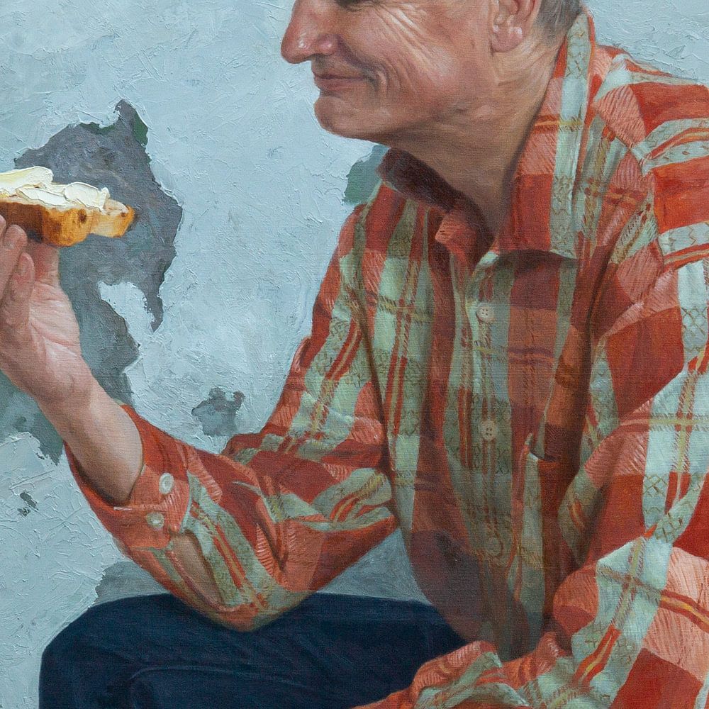 So kenne ich meinen Vater: Mit einem zufriedenen Blick, der sich an kleinen Dingen erfreut. Er ist immer bereit zu helfen. Wenn es etwas zu tun gibt, krempelt er sofort die Ärmel hoch und trägt dabei oft diese Bluse. Seine Anwesenheit bedeutet für mich mehr als ein zusätzliches Paar Hände. Die Hausarbeit stärkt unsere Bindung. Zwischendurch bleibt auch Zeit, sich hinzusetzen und ein dickes Stück Rosinenbrot mit Butter zu genießen, das er so liebt.
