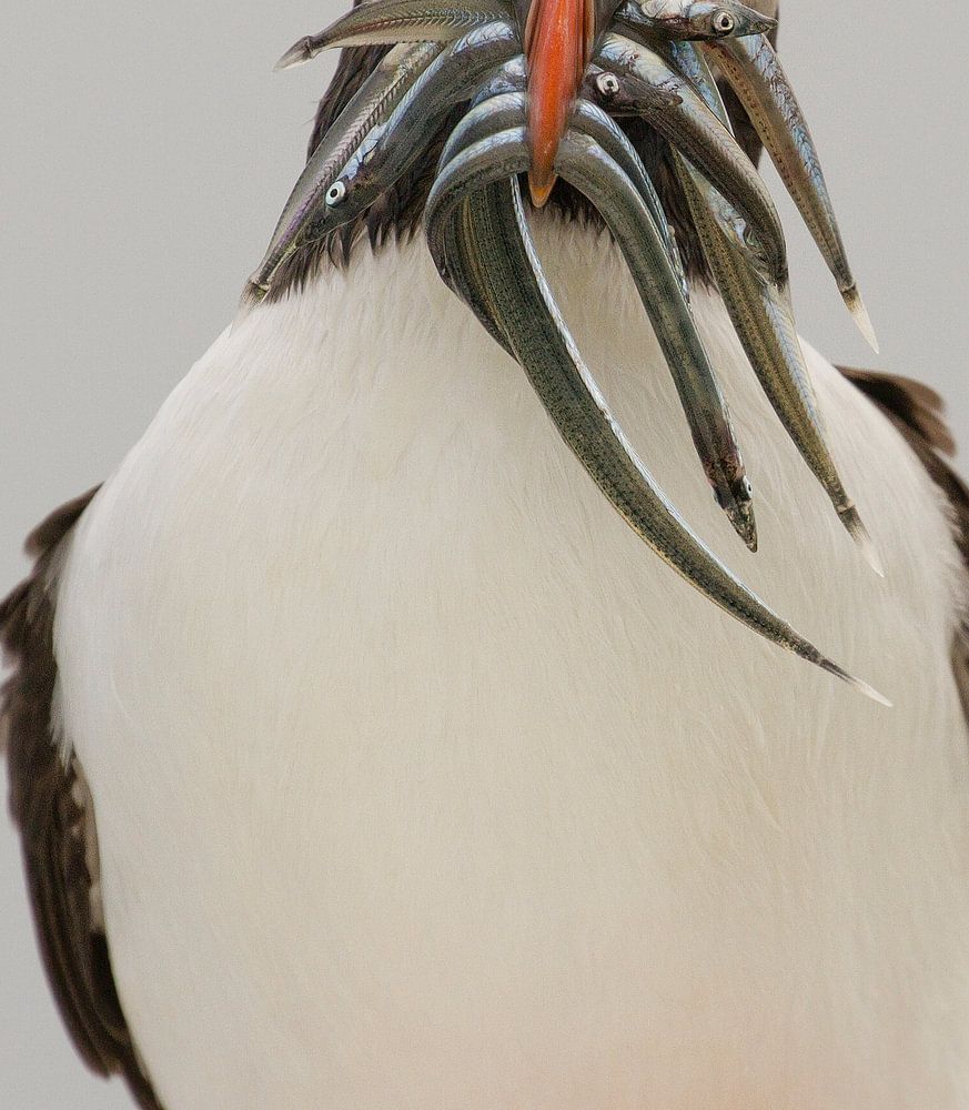 Papegaaiduiker met een bek vol vis wandelend naar zijn nest op de Farne eilanden in het noorden van Engeland