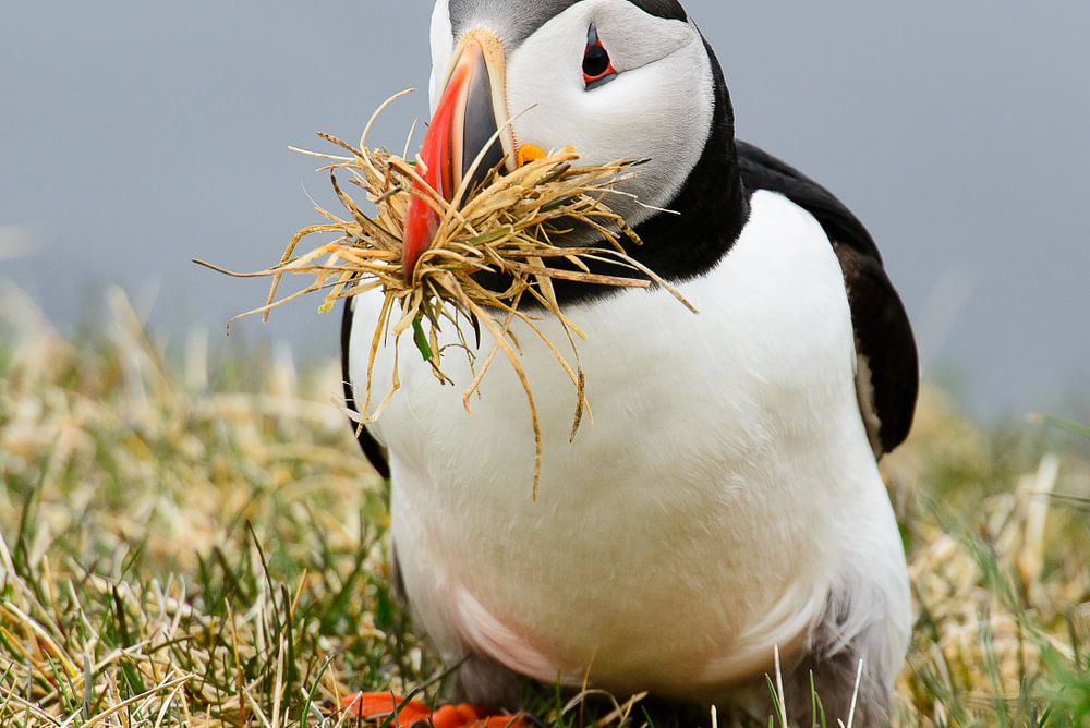 Pappageitaucher beim Nestbau, Latrabjarg, Westfjorde, Island