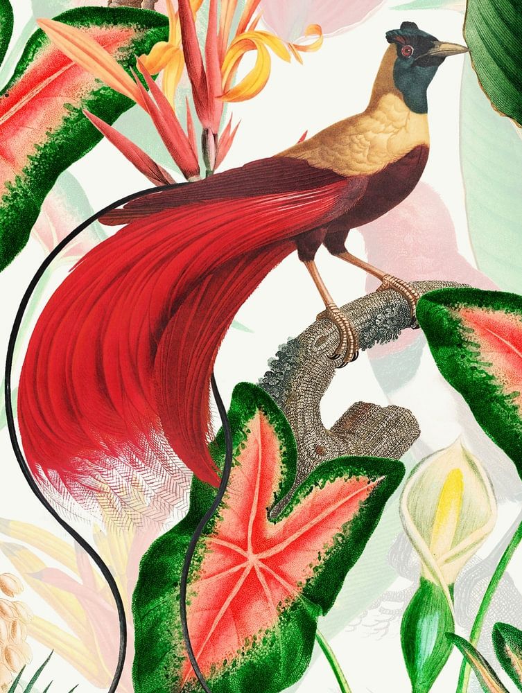 Das Design von Uta Naumann zeigt eine fesselnde Szene mit einem handgemalten roten tropischen Paradiesvogel als Mittelpunkt. Vor einem sauberen weißen Hintergrund wird dieser markante Vogel elegant von üppigen tropischen Blättern, sich wiegenden Palmen und lebhaften exotischen Blumen eingerahmt. Das Design fängt die Essenz eines üppigen und lebendigen tropischen Paradieses ein und erfüllt den Raum mit einem Ausbruch von Farbe und natürlicher Schönheit. Dieses exquisite Stück passt perfekt in ein gut beleuchtetes Wohnzimmer oder einen sonnenbeschienenen Wintergarten. Es verleiht dem Raum einen Hauch von exotischer Eleganz und künstlerischem Charme und ist gleichzeitig ein visuell fesselnder Blickfang, der Gefühle der Entspannung und Bewunderung für die Wunder der Natur hervorruft.