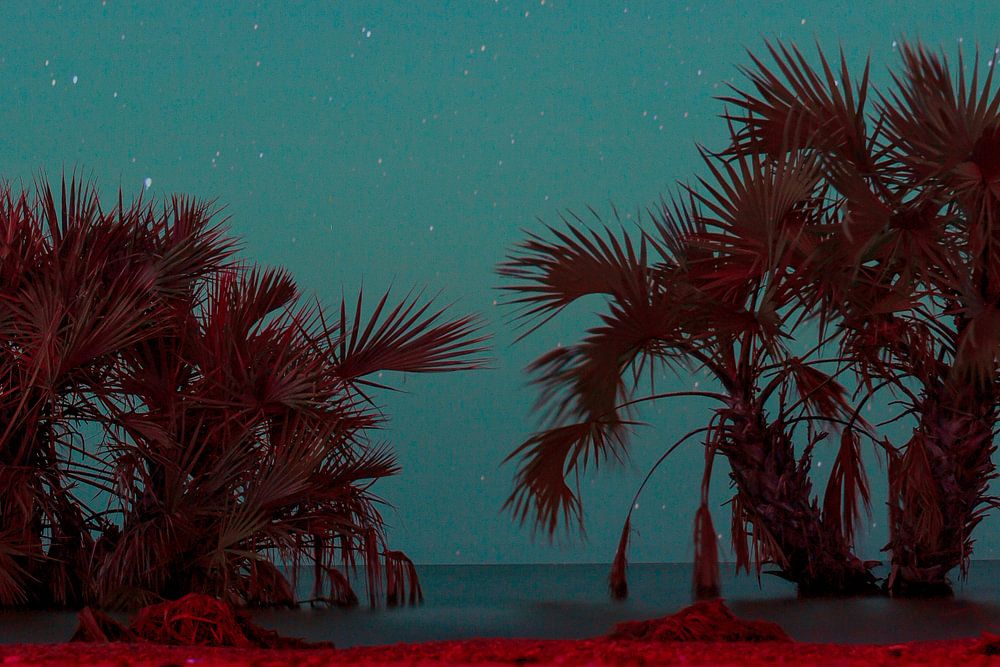 Nachtaufnahme am Strand mit Palme, Stimmungslicht und Sternenhimmel