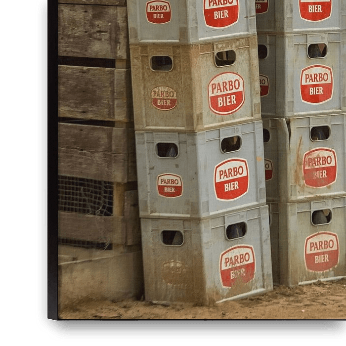 Zwei Stapel Parbo-Bierkisten in einem baufälligen Holzschuppen in Surinam