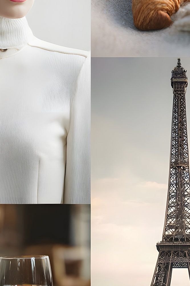 Das Bild zeigt ein modernes, farbiges Moodboard aus vier Motiven: ein stilvolles Frauenporträt mit Sonnenbrille und klassischem Mantel, frische Croissants als Symbol französischer Backkultur, ein gedeckter Tisch mit Rotwein und Dessert sowie der Eiffelturm als ikonisches Wahrzeichen von Paris. Gemeinsam inszenieren die Motive Mode,…