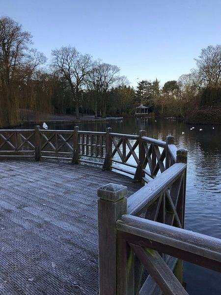 Dieser Wunderschöne Steg am Morgen in einem Park voller Frost