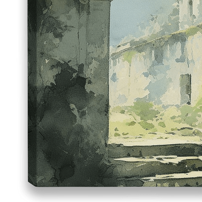 Passage | Grün - Dieses Gemälde zeigt einen idyllischen, mit üppigem Grün und Kletterpflanzen bewachsenen Durchgang mit Steinbogen, der zu einer Treppe und einem altmodischen Gebäude im Hintergrund führt. Der Aquarellstil verleiht dem Bild eine verträumte, atmosphärische Qualität, wobei die hellen und dunklen Grün-, Beige- und Grautöne…