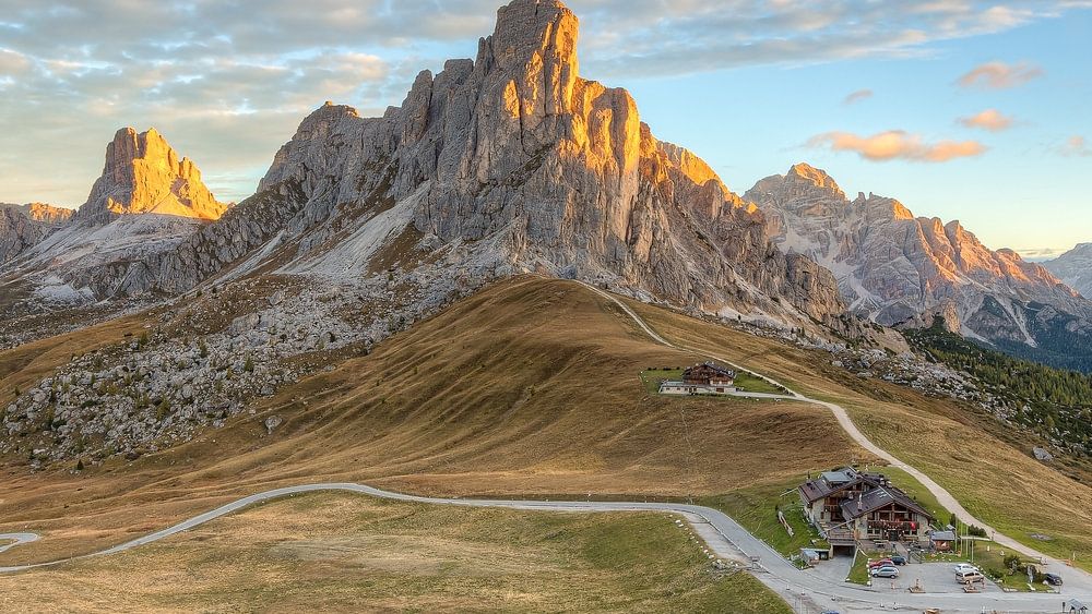 Der Passo di Giau ist ein Gebirgspass zwischen Pocol / Cortina d’Ampezzo und Selva di Cadore in der italienischen Provinz Belluno. Er zählt zu den schönsten Pässen der Dolomiten. Von einem kleinen Hügel hat man diesen wunderschönen Blick über den 2.236 m hoch gelegenen Pass mit dem Monte Nuvolau im Hintergrund. An diesem Morgen hatte ich Glück, es waren ein paar schöne Wolken am Himmel die zusammen mit den Berggipfeln von den ersten Sonnenstrahlen des Tages angeleuchtet wurden.