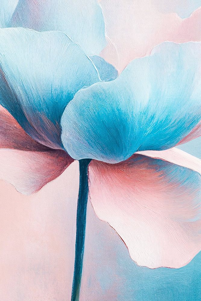 Dieses raffinierte Design zeigt eine wunderschöne Blume in sanften Pastellfarben, wobei sich Blau und Rosa harmonisch ergänzen. Die zarten Pinselstriche und subtilen Texturen sorgen für einen ruhigen und verträumten Look, der jedem Raum eine beruhigende Atmosphäre verleiht. Dieses Kunstwerk ist eine ausgezeichnete Wahl für Liebhaber minimalistischer und moderner Dekoration. Es ist ideal, um einem Wohnzimmer, einem Esszimmer oder einem Schlafzimmer einen Hauch von Raffinesse zu verleihen.