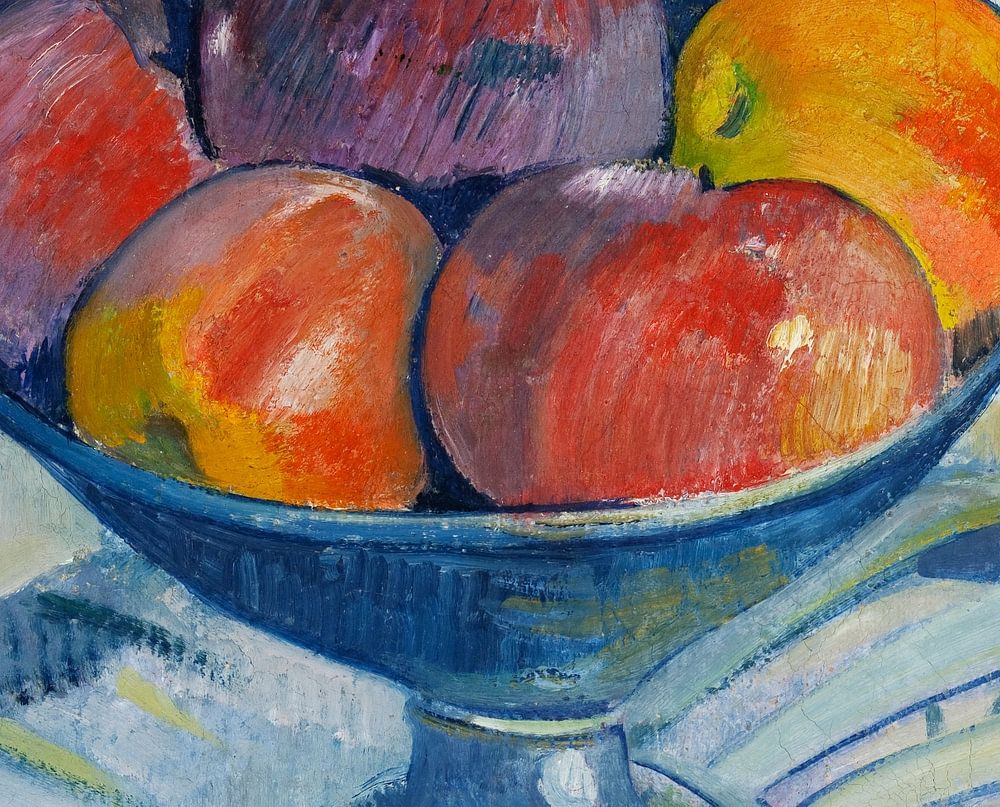 Gaugin malte ein Stillleben mit Früchten in Rot und Gelb auf einem Metallteller auf einem Stuhl im Garten mit einem weiteren Apfel in Grün darauf.