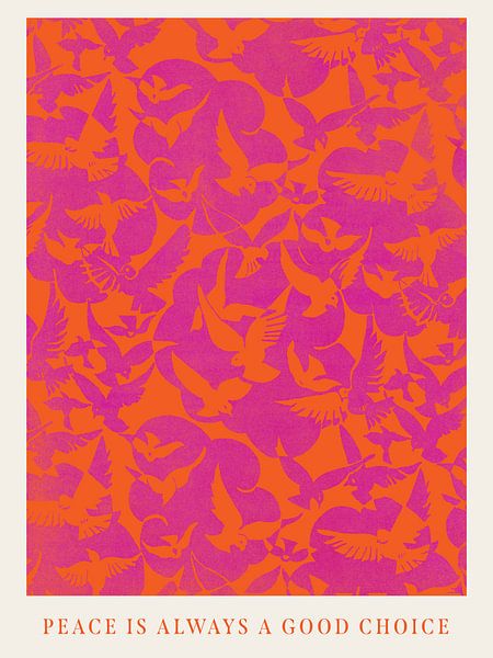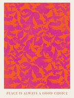 Dieses Motiv zeigt Friedenstauben in orange auf pinkem Untergrund. Darunter steht in English, dass Frieden immer eine gute Wahl ist.