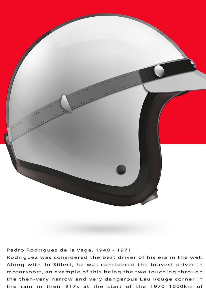 Druckgrafik mit den persönlichen Sturzhelmen berühmter Rennfahrer der 1950er und 1960er Jahre.