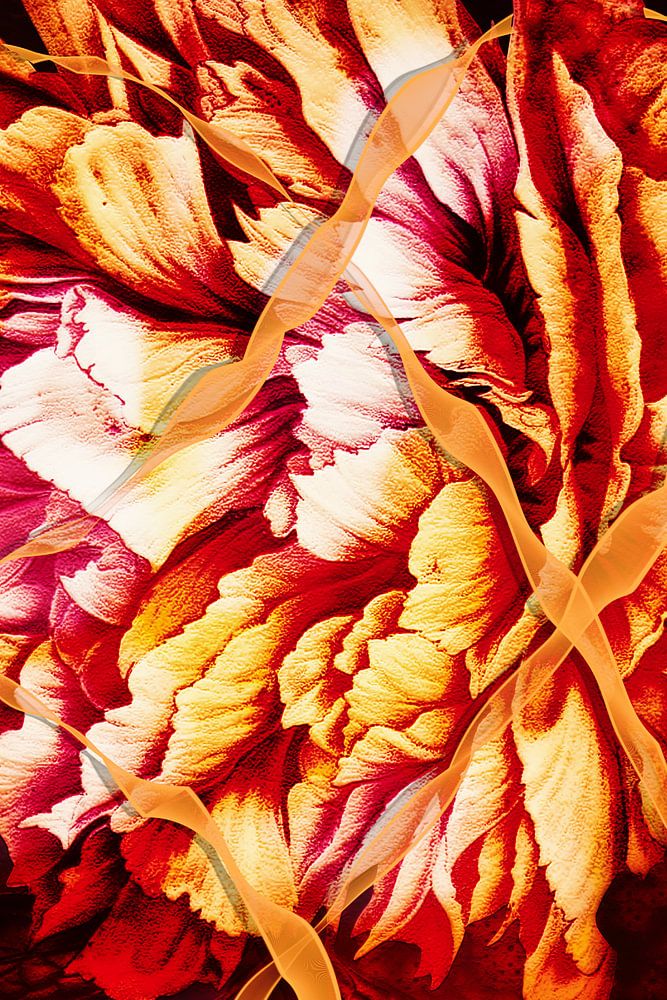 Eine Peonia oder Pfingstrose, eingewickelt in ein herzförmiges Band, ganz in den Farben der Liebe: verschiedene Rottöne. Die Pfingstrose ist von Wolken und Vögeln umgeben. Dieses künstlerische, rechte Hälfte eines Diptychons, ist ein sogenannter neuer Meister.