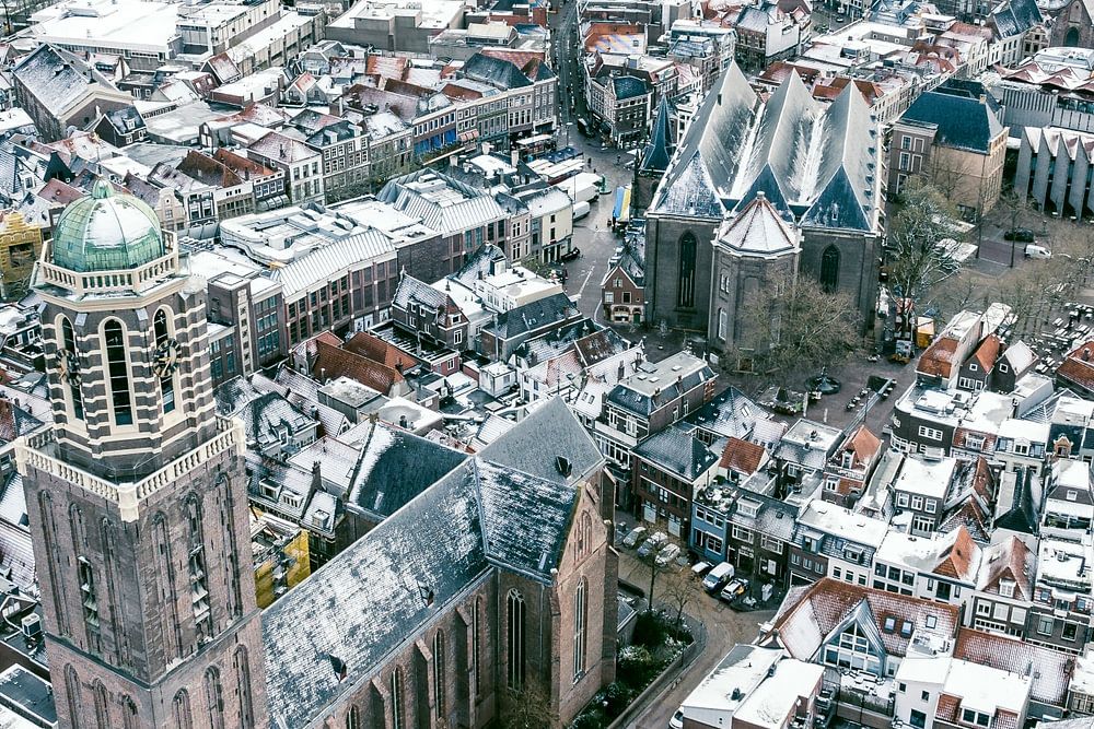 Drohnenansicht des Peperbusturms in der Stadt Zwolle, Overijssel, an einem kalten Frühlingsmorgen. Der Kirchturm hebt sich von den schneebedeckten Dächern im Stadtzentrum von Zwolle im Hintergrund ab. An diesem außergewöhnlich kalten Frühlingstag, der sich eher wie Winter anfühlt, liegt etwas Schnee auf den Dächern.