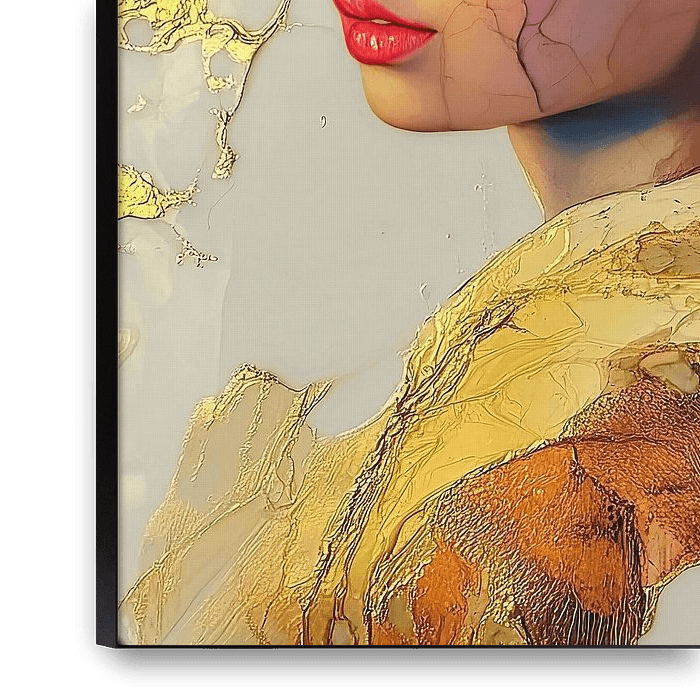 Dieses digitale Kunstwerk von mir zeigt eine raffinierte Neuinterpretation eines klassischen Porträts einer Frau mit Perle, in dem Tradition und moderne Bildsprache miteinander verschmelzen. Das Gesicht der Frau ist sanft und realistisch ausgearbeitet, während ihre Haut und Kleidung aus transparenten Farbschichten und goldfarbenen…
