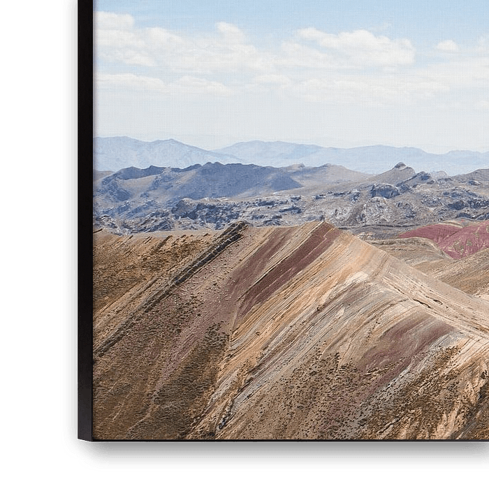 Peruanische Frau in traditioneller Kleidung hoch in den Bergen an einem Regenbogenberg in Peru. Südamerika.
