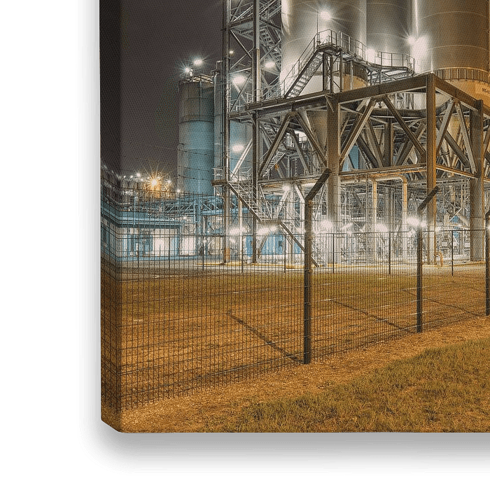Bestelle das Foto Petrochemie-Produktionsanlage mit großen Silos in der Nacht, Antwerpen von Tony Vingerhoets als Reproduktion auf Leinwand, Alu-Dibond, als Poster, Fototapete oder Acrylglasbild.