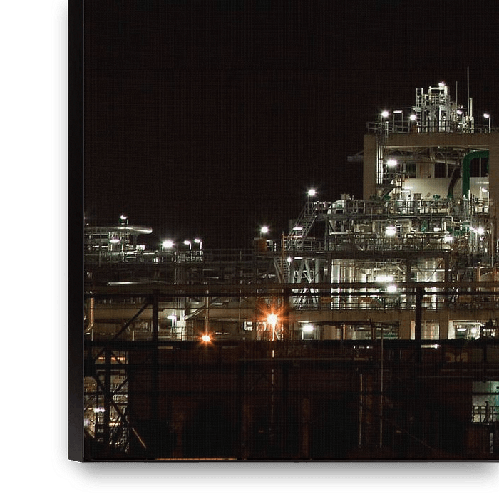 Bestelle das Foto Petrochemikalien bei Nacht von Guido Akster als Reproduktion auf Leinwand, Alu-Dibond, als Poster, Fototapete oder Acrylglasbild.