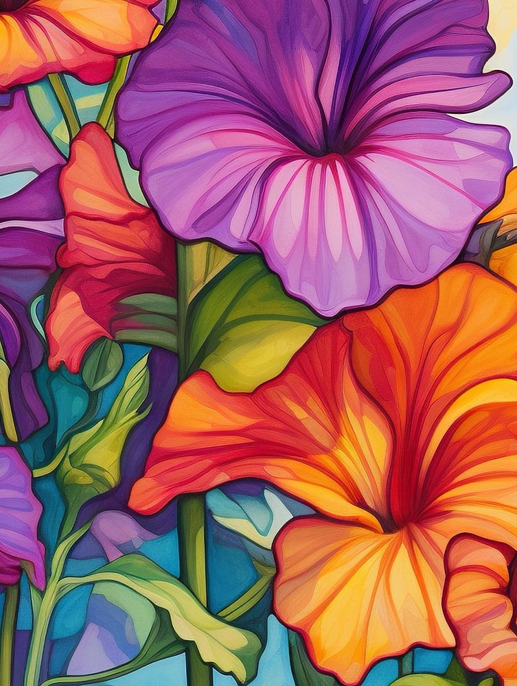 Petunia Painting | Floral Sunrise Symphony - Diese Blume Malerei zeigt eine lebendige Palette von Petunien's, detailliert gegen eine sanfte Morgendämmerung Himmel, jedes Blütenblatt zum Leben erwacht mit nachdenklichen Pinselstrichen.