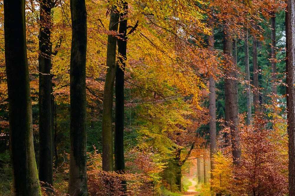 Pfad mit Buchen auf beiden Seiten in einem Wald an einem schönen Herbsttag im Naturschutzgebiet Veluwe am De Haelberg bei Epe.