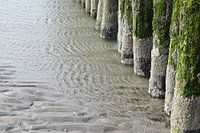 Pfosten am Strand von Schouwen-Duiveland, sie sind mit Grünalgen bewachsen und das Meerwasser fließt dazwischen.