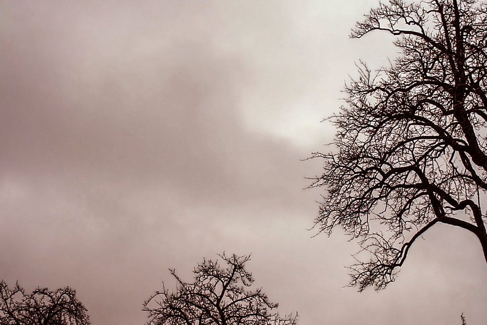 Pfaffenbron im Norden des Elsass. Am Morgen, Nebel, Dezember, so kahle Bäume in den Hügeln. Monochrome Wiedergabe. Verzweifelt oder eher schön?