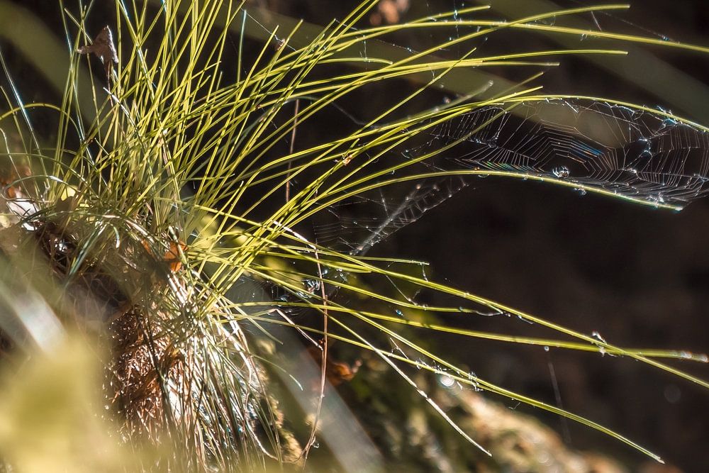 Ein Traum von einem Spinnennetz hat sich der kleine Achtbeiner hier erschaffen. Wahrscheinlich brauchte es bereits mehrere Anläufe dazu, denn zwischen zwei Grashalmen gewoben scheint so ein Netz keine lange Lebensdauer zu haben. Allein, die Spinne stört es nicht. Sie hofft wohl einzig, ihre Spinnkünste verrichten ihre Arbeit und fangen die eine oder andere Mahlzeit ein.