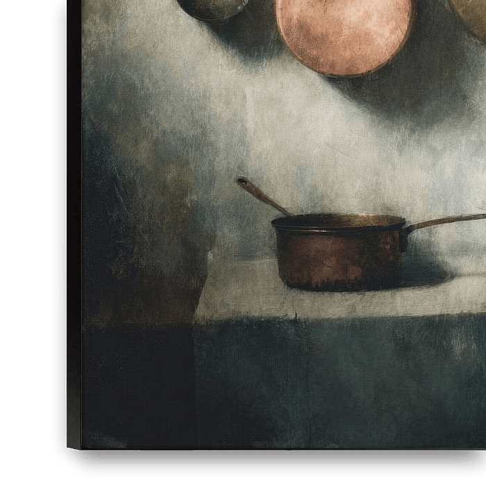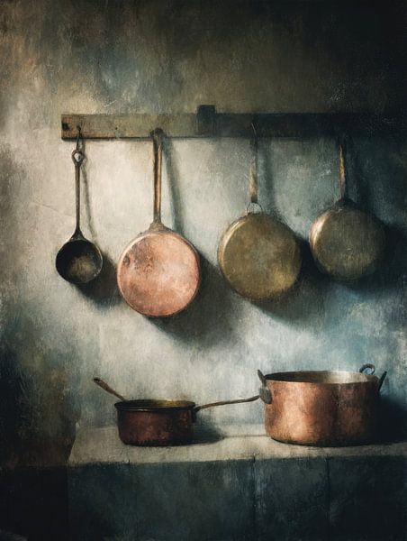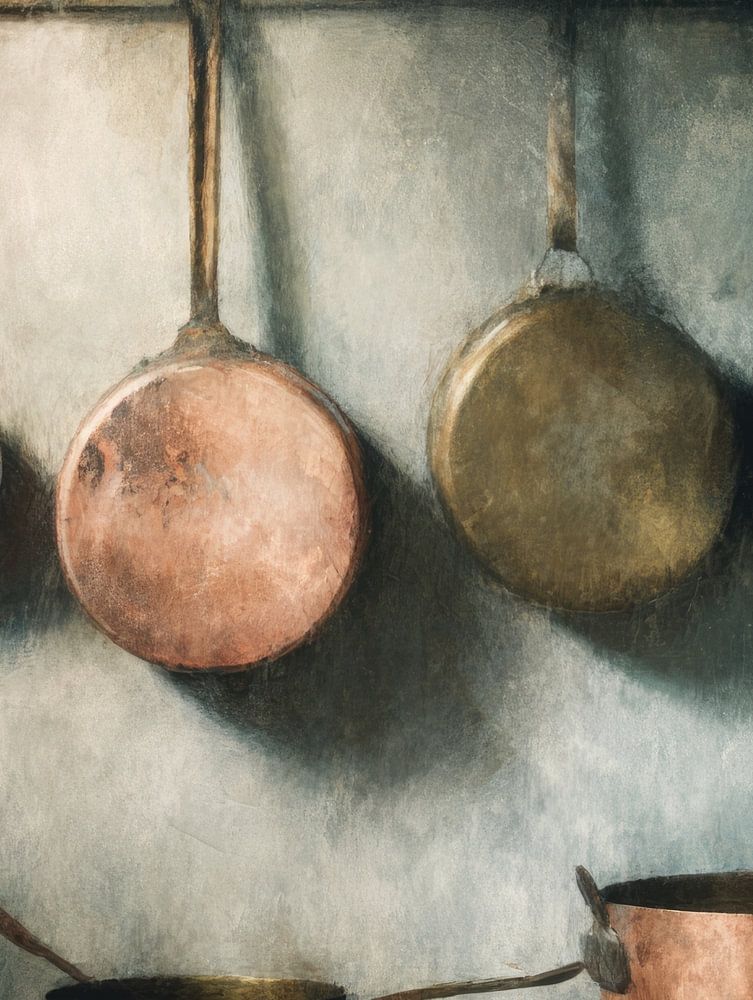 Alte Pfannen hängen in weichem Licht vor einer verwitterten Wand. Das Bild weckt Erinnerungen, Handwerk und Häuslichkeit. Warm und zeitlos.
