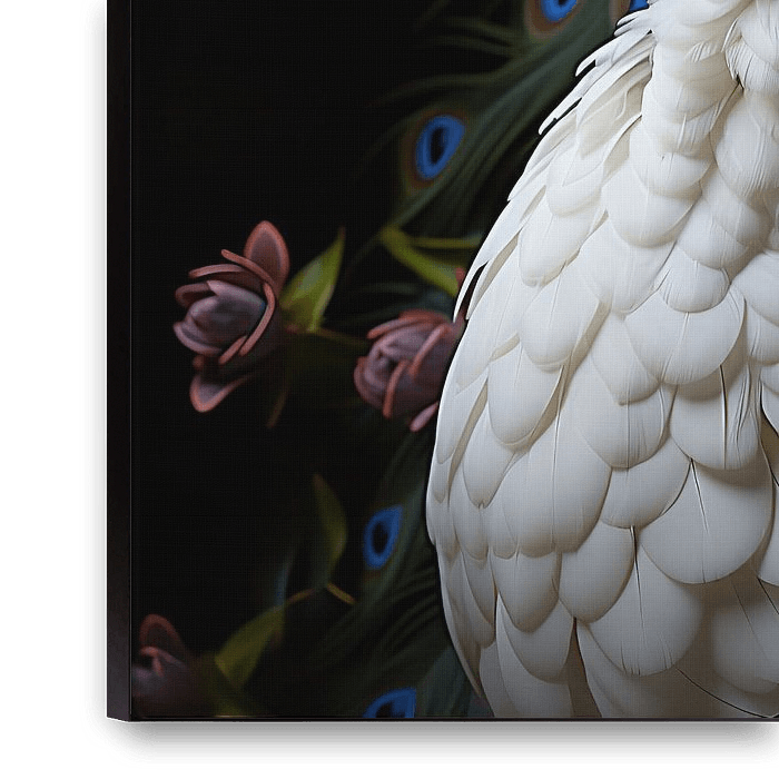 Das Bild zeigt einen wunderschönen weißen Pfau, der von der Seite fotografiert wurde, umgeben von einem bezaubernden Stillleben aus roten Blumen und den Federn des Pfaus, die einen atemberaubenden Kontrast zum schwarzen Hintergrund bilden. Das gesamte Bild schafft eine Atmosphäre von opulenter Anmut und Pracht.