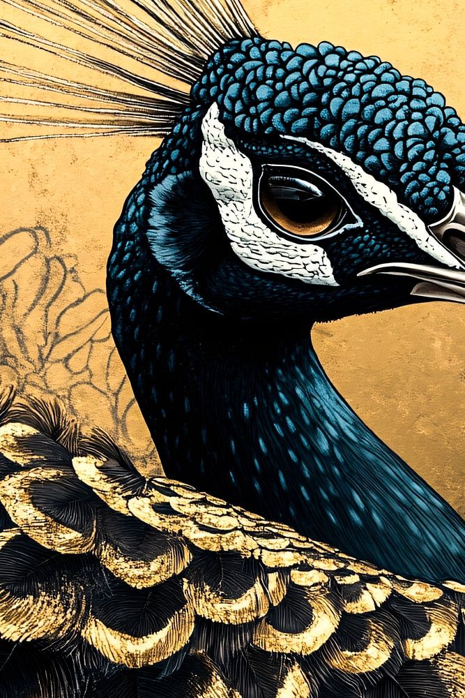 Dieses wunderschöne Bild zeigt einen eleganten Pfau mit reichen goldenen Akzenten auf seinen Federn. Das Design strahlt Luxus und Raffinesse aus und passt damit perfekt in stilvolle Innenräume. Die Kombination aus tiefen Blautönen und glänzendem Gold schafft einen fesselnden Kontrast, der sowohl modern als auch zeitlos ist. Ideal, um Ihrem Wohn-, Schlaf- oder Esszimmer einen luxuriösen Touch zu verleihen. Lassen Sie sich von der Schönheit der Natur inspirieren, die in diesem künstlerischen Meisterwerk eingefangen wurde.