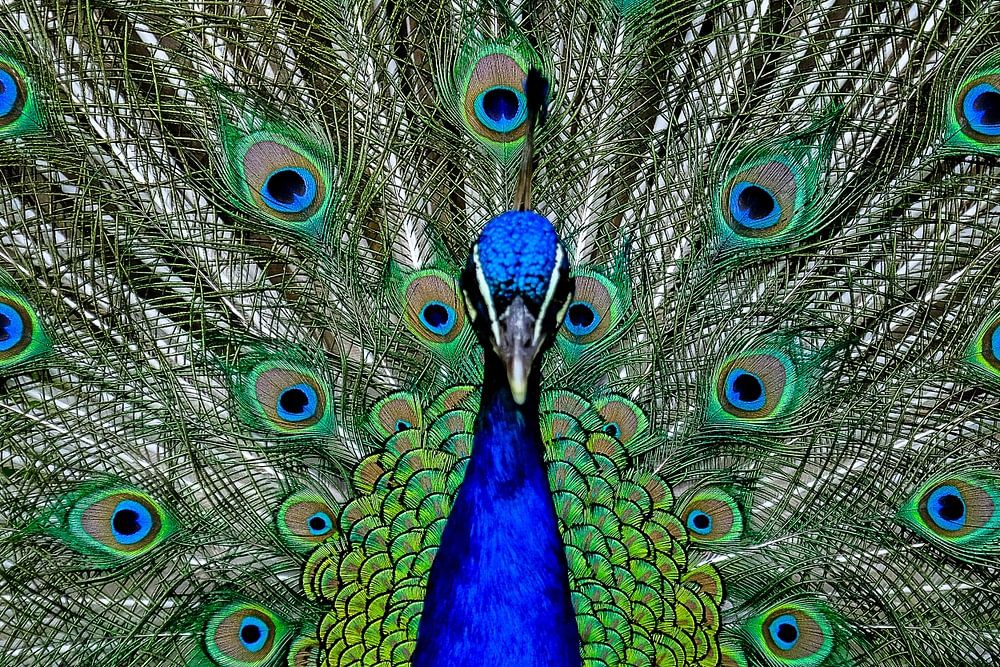 Ein anmutiger Pfau zeigt sein Gefieder.