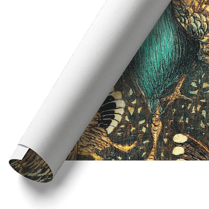 Eine expressionistische Illustration eines Pfau in goldenen, gelben Farben und Grüntönen vor einem prachtvollen Hintergrund.