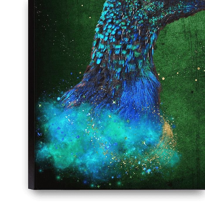 Bestelle dieses abstrakte Wandbild Pfauenkopf mit Goldglitter von Postergirls als Reproduktion auf Leinwand, Alu-Dibond, als Poster, Fototapete oder Acrylglasbild.