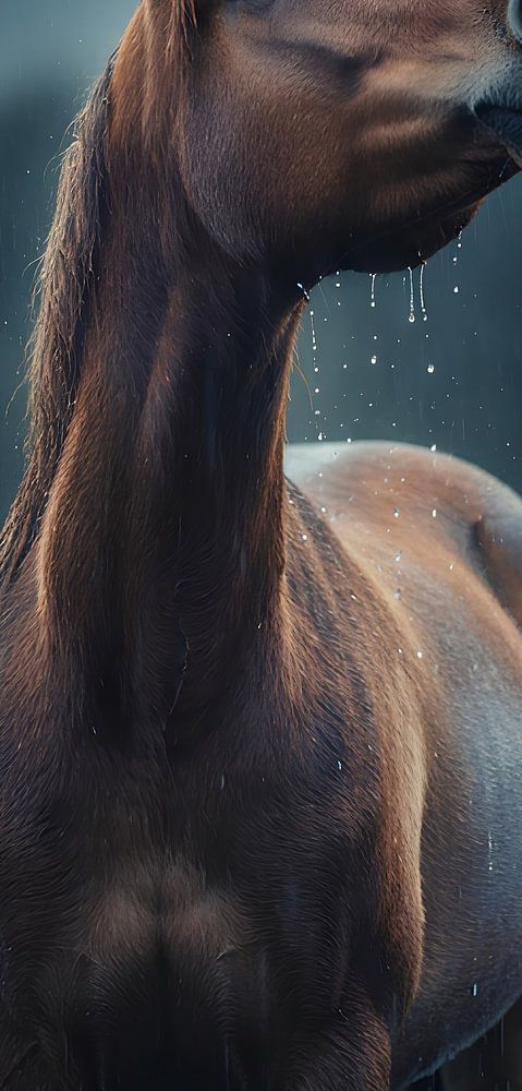 In diesem Kunstwerk sehen wir ein majestätisches Pferd, das im Regen steht, den Kopf leicht nach oben geneigt, als würde es den Himmel betrachten. Es steht im Wasser, das ihm bis zu den Schultern reicht, und die Regentropfen, die auf sein nasses Fell fallen, sind deutlich zu erkennen. Die besondere Schönheit liegt in den Details: das nasse, schimmernde Fell, der feine Sprühnebel um seine Mähne und die subtilen Wellen im Wasser, die durch seine Bewegungen entstehen.