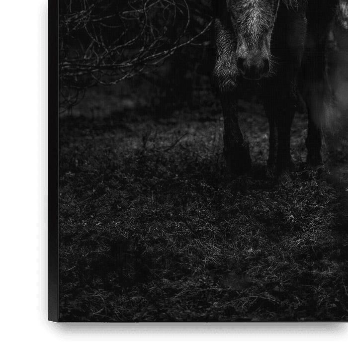 Diese kraftvolle Schwarz-Weiß-Fotografie zeigt ein Pferd, das langsam aus dem Schatten des dichten Waldes auftaucht. Die kontrastreichen Farbtöne heben die zottelige Struktur des Fells und die silberne Mähne hervor und schaffen eine fast filmische, mystische Atmosphäre. Die Zweige und das weiche Licht umgeben das Tier auf natürliche…